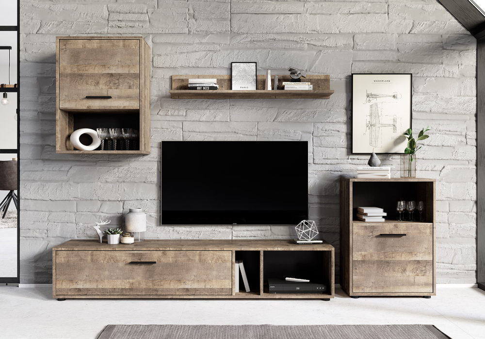 1. Подвесной шкафт (ШхВхГ): 50х67.8х30 см - 1 шт.; 2. Стоячий шкаф (ШхВхГ): 50х69.8х30 см - 1 шт.; 3. Подвесная полка (ШхВхГ): 100х15х16.6 см - 1 шт.; 4. Тумба TV (ШхВхГ): 160х30.8х36 см - 1 шт.