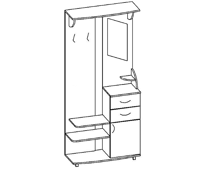 Аккуратная прихожая "Юлианна" представляет собой панель тёмного шоколадного цвета, на которую с одной стороны крепятся три больших трёхрожковых крючка для одежды, а с другой зеркало оригинальной формы. Сверху прихожая "Юлия" украшена небольшим карнизом, который при желании может служит полочкой для уборов. Под крючками для одежды гарнитура "Юлия" есть три открытых полки, верхняя из которых может использоваться как сиденье. Справа под зеркалом находиться два выдвижных ящика и тумба для хранения вещей. Фасады выдвижных ящиков и дверка тумбы прихожей "Юлия" выполнены в контрастном цвете белфорт, за счет чего прихожая смотрится стильно, а не мрачно.