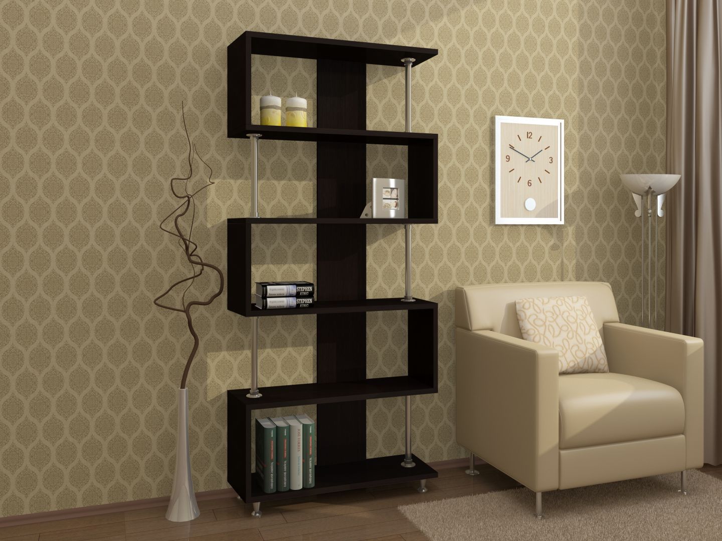 Открытые полочки образуются с помощью зигзагообразного крепления к несущему профилю и металлических штанг.Хромированный блеск металла выглядит особенно выигрышно в сочетании с элегантными ножками, которые выполняют весьма полезную функцию – приподнимают стеллаж над полом, предохраняя его от влаги, и позволяют нивелировать неровности пола.